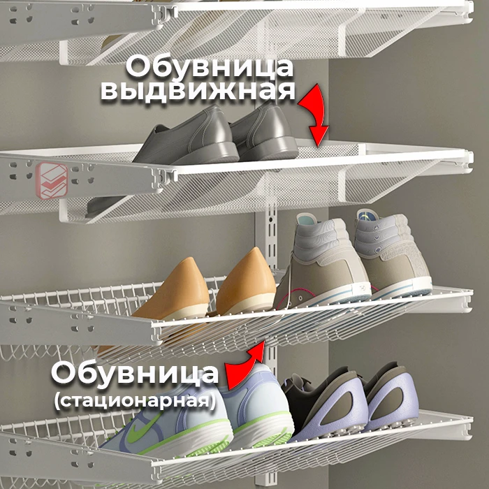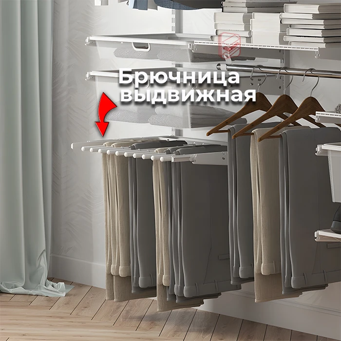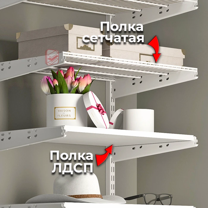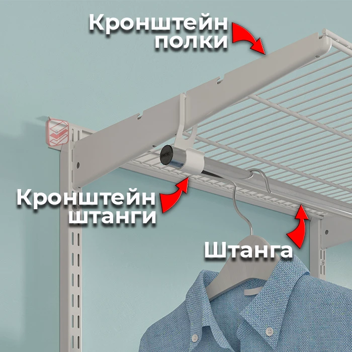 Комплект включает все необходимые элементы для быстрого монтажа, включая рельс, стойки, полки, штангу и кронштейны. Удобные компоненты позволяют создать функциональную и стильную гардеробную, подходящую для любого помещения.