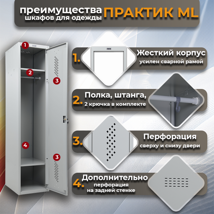 Шкаф ML 11-40 — это надежное, прочное и функциональное решение для хранения одежды, подходящее для использования в различных помещениях: от офисов и складов до учебных заведений и производственных объектов. Он оснащен жестким корпусом и усилен сварной рамой, что обеспечивает отличную устойчивость и долговечность конструкции.