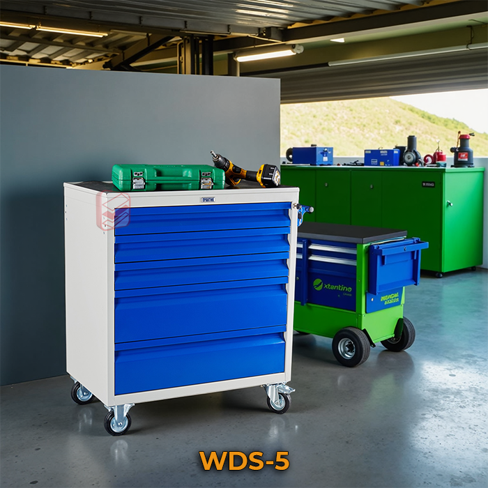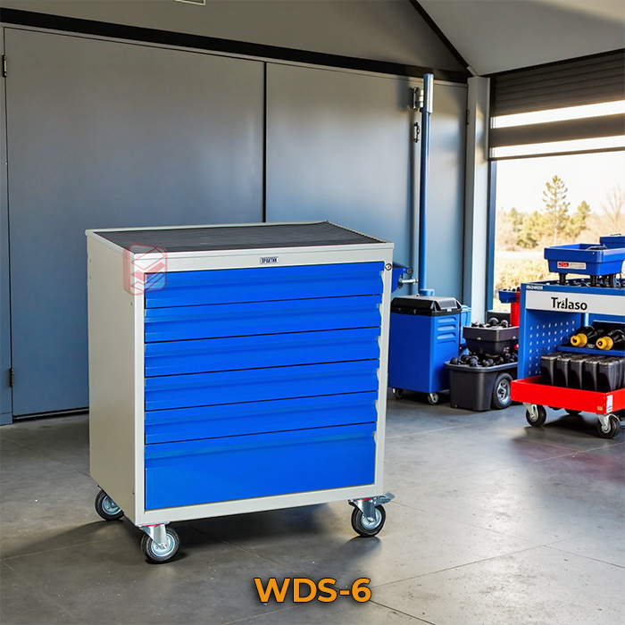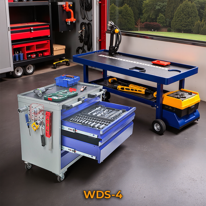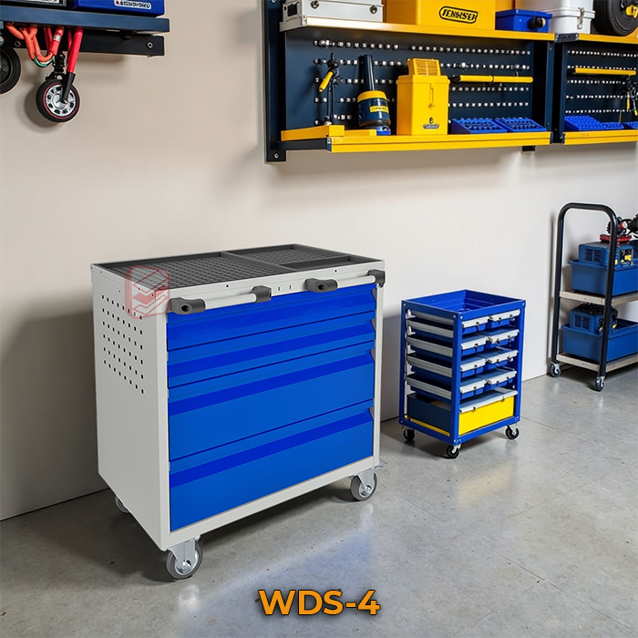 Тележка инструментальная WDS-4 – надежное решение для хранения и транспортировки инструментов и оснастки в автомастерских, производственных предприятиях и других ограниченных рабочих пространствах.